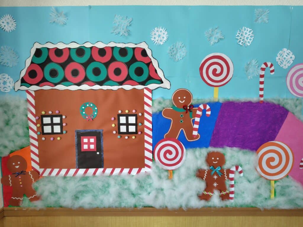 「壁一面に可愛くて冬らしいアートが完成しました!!🍭🍪」